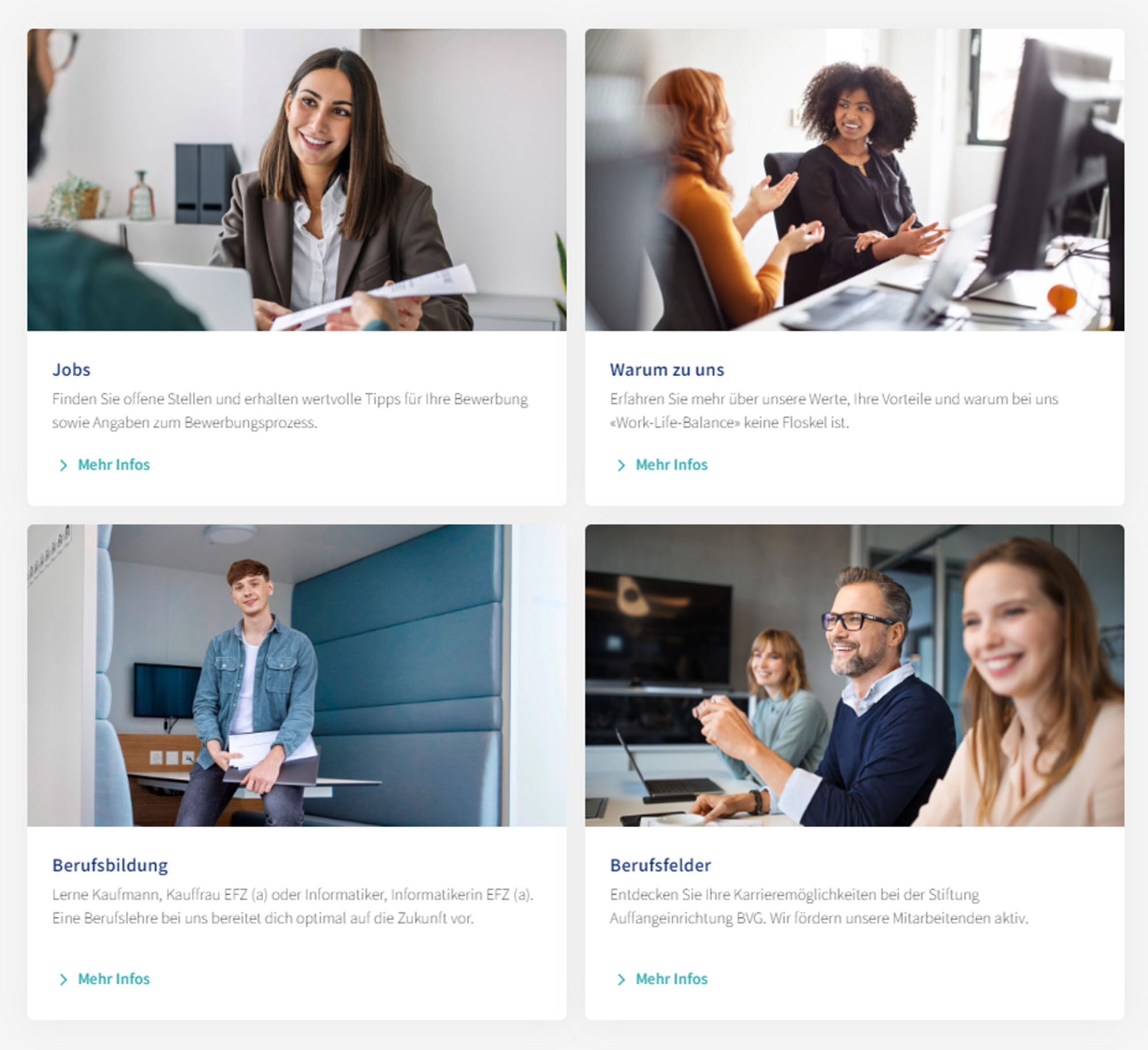 Herzstück der Website ist das neue Karriereportal. Dort überzeugen zahlreiche Argumente, warum es sich lohnt, sich bei uns zu bewerben – farbig und übersichtlich. Im Unternehmens-Clip sowie in Bild-Statements und Video-Botschaften lesen und sehen Sie, warum unsere Mitarbeiterinnen und Mitarbeitern so gerne bei der Stiftung Auffangeinrichtung BVG arbeiten.