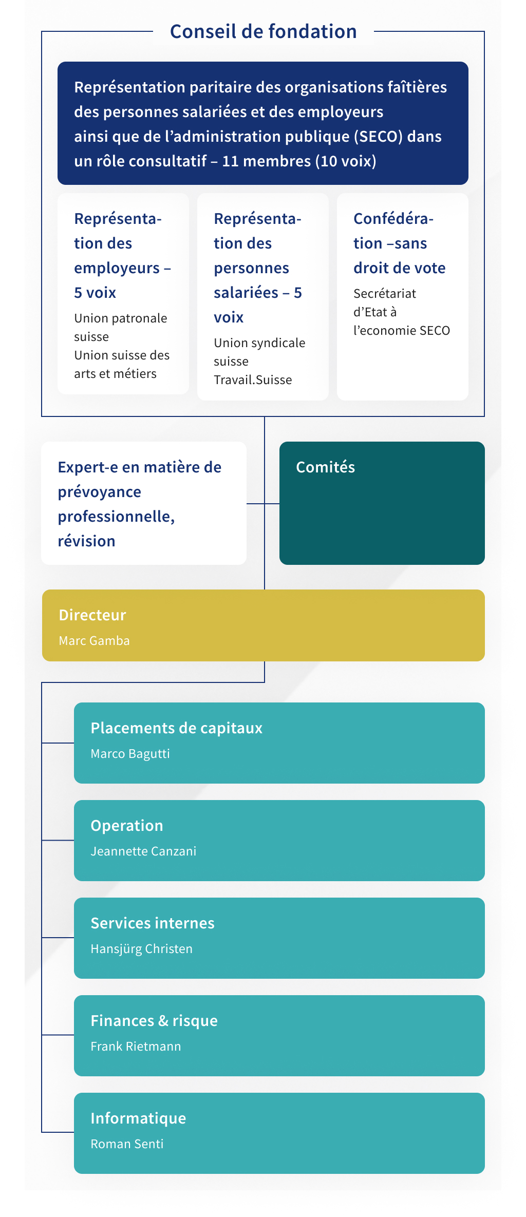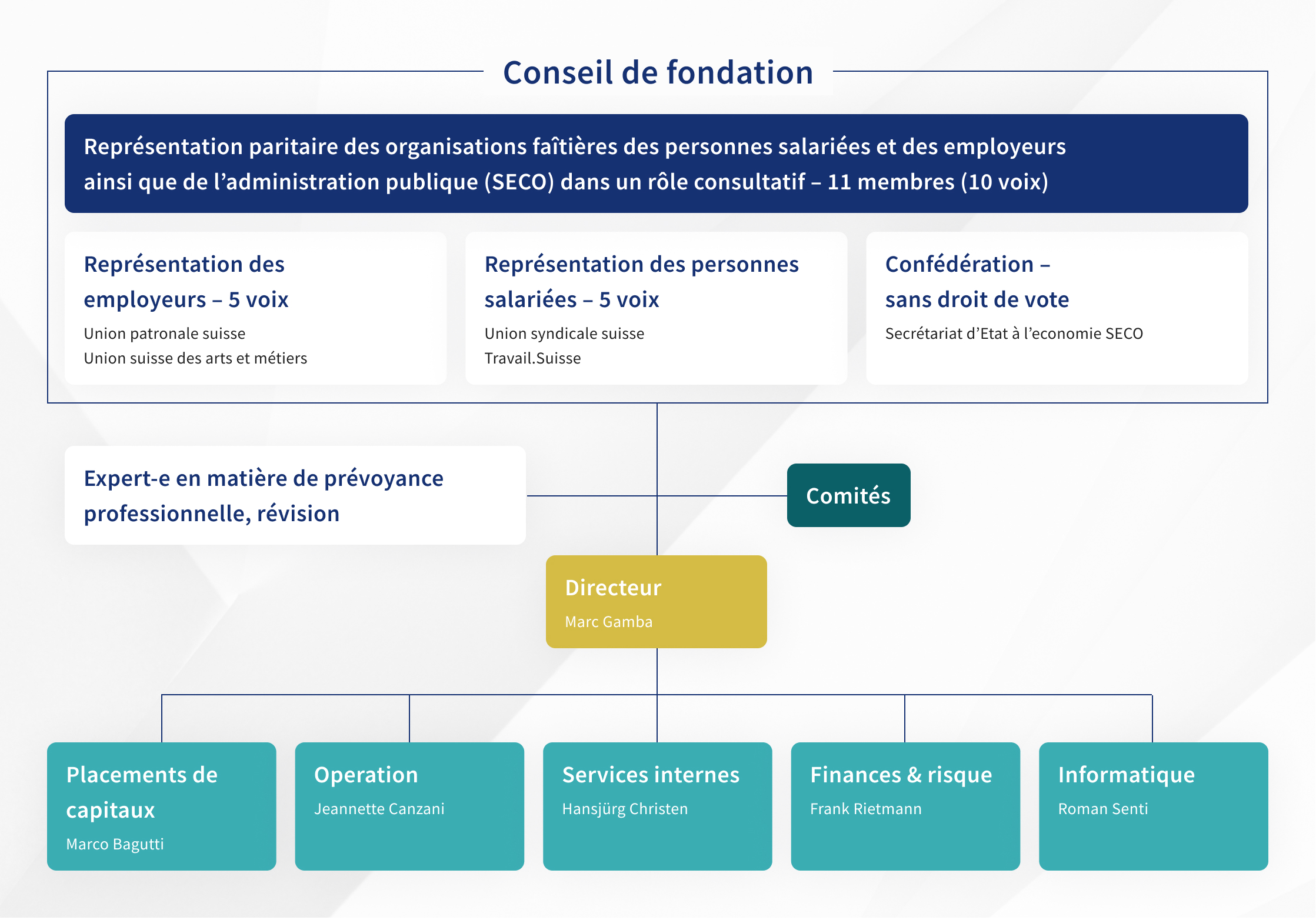 Le conseil de fondation est l’organe suprême de la Fondation institution supplétive LPP. Il se compose d’une représentation paritaire des organisations faîtières nationales des personnes salariées (Union syndicale suisse et Travail.Suisse) et des employeurs (Union patronale suisse et Union suisse des arts et métiers) de cinq membres chacune. L’administration publique est en outre représentée par un membre sans droit de vote.