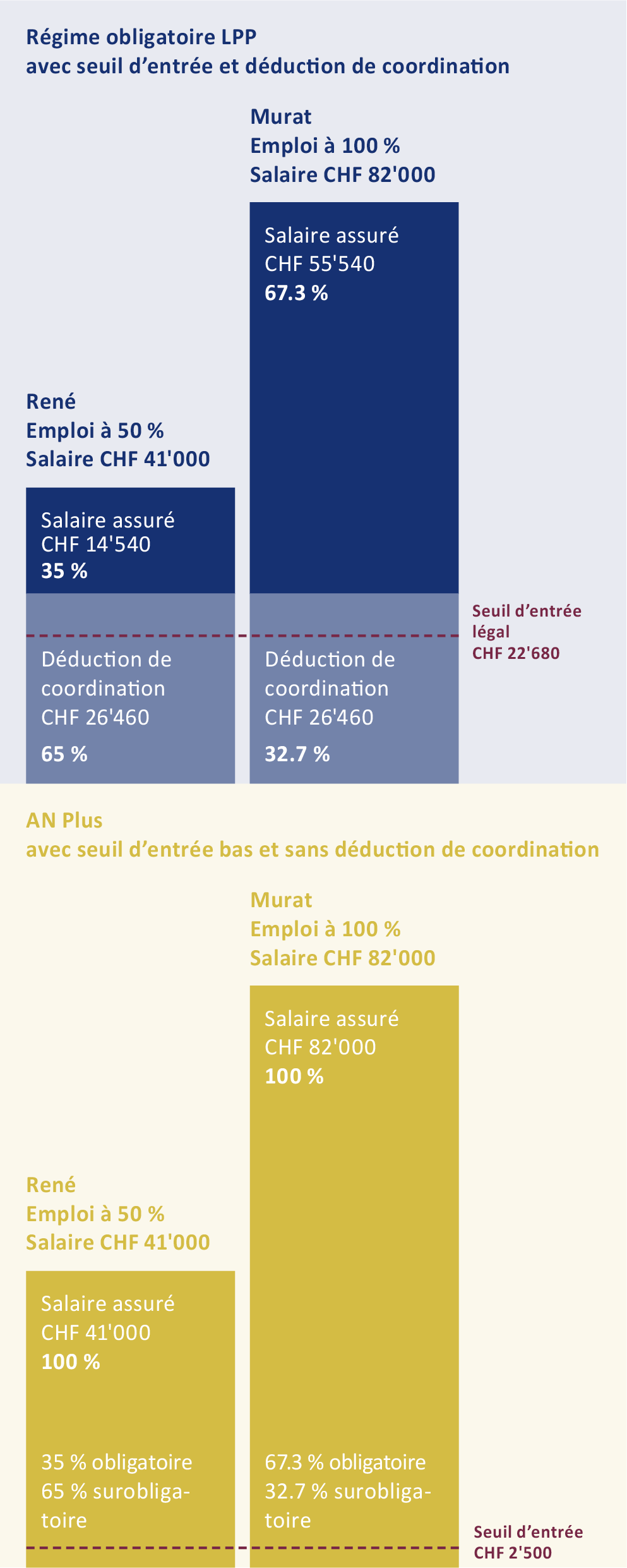 À partir d’un revenu supérieur à CHF 2'500, l’ensemble du salaire est assuré dans AN Plus, jusqu’au montant-limite supérieur de CHF 90'720 – sans déduction de coordination. Dans le plan AN Plus, la part du salaire perdue dans le régime obligatoire LPP en raison de la déduction de coordination est assurée à titre surobligatoire.