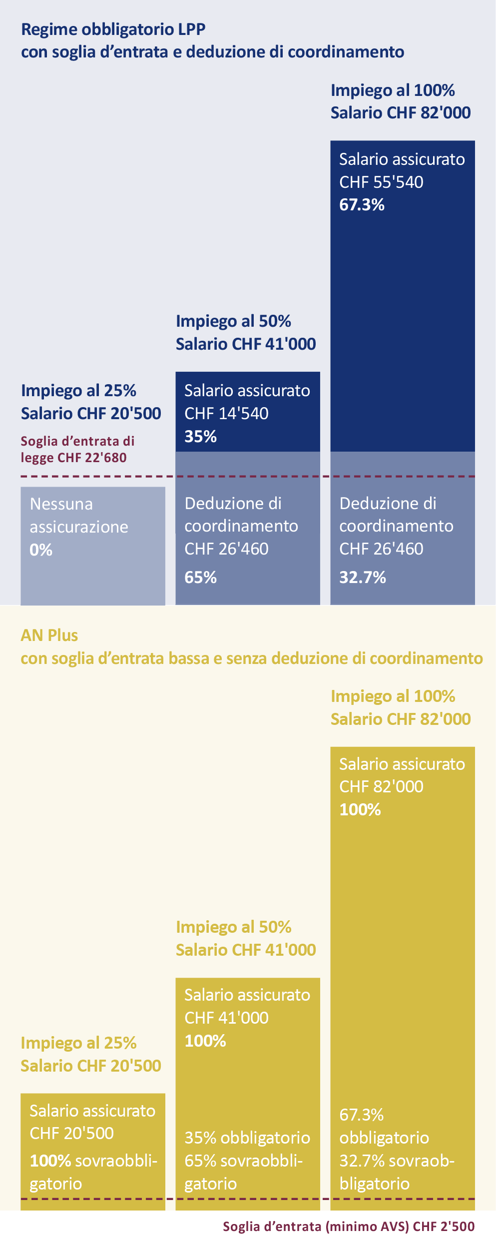 AN Plus: I dipendenti sono assicurati con il 100% del loro salario (fino al massimo all’importo limite superiore). Più reddito assicurato significa avere di vecchiaia più elevato e migliori prestazioni in caso d’invalidità o decesso.